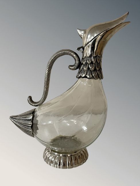 A glass and silver plate decanter in the form of a bird, height 28 cm.
