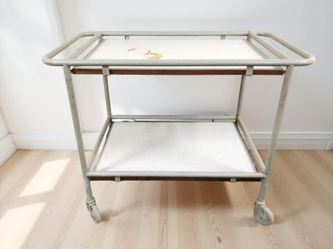 An enamelled metal and melamine two tier trolley, length 105 cm