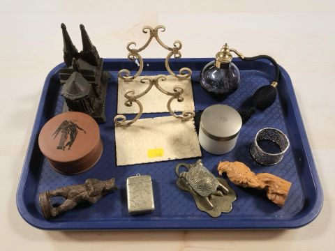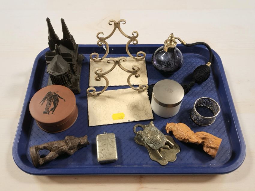 A pair of wrought metal bookends, trinket box in the form of a cathedral, two carved wooden figures of a bear and an eagle, a plated vesta case, an atomiser, etc.