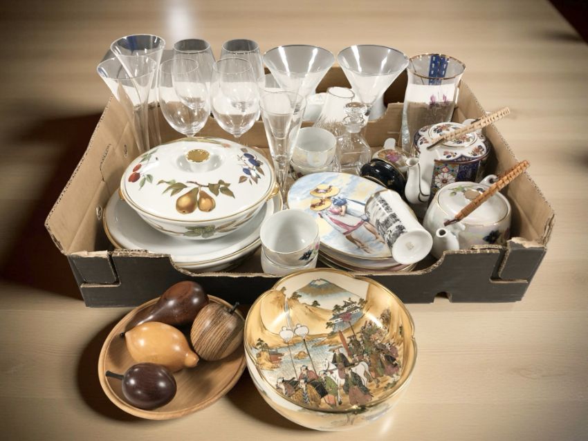 A group of oriental export ceramics, treen, drinking glasses, etc. (1 box)