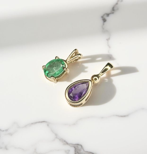 An emerald pendant and a pear-shaped amethyst pendant, set in 9ct gold, longest 17mm.
