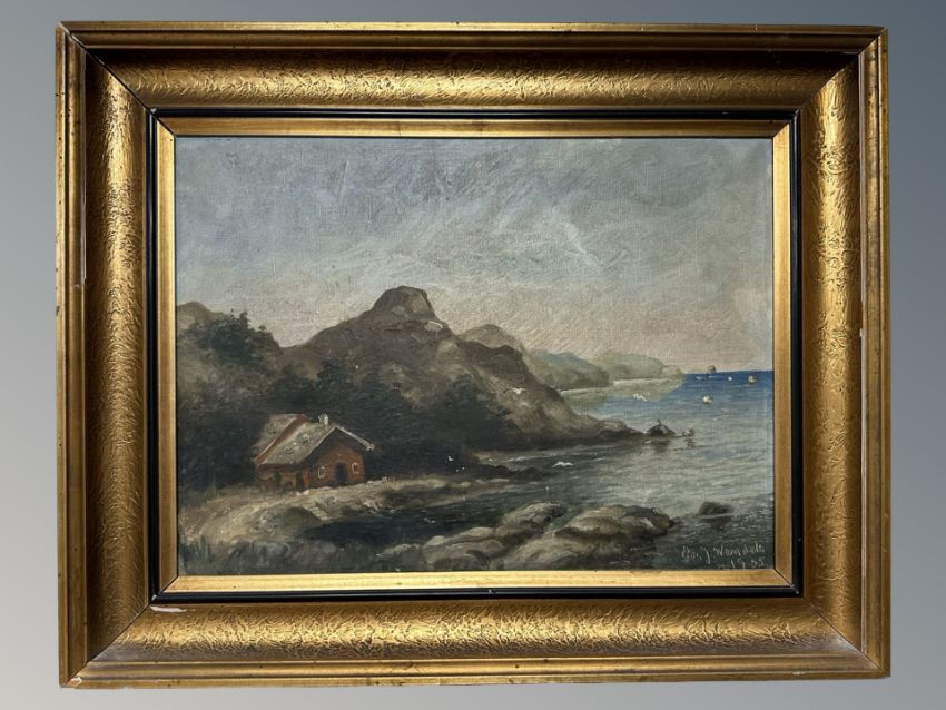 E J Wemdele : Building by a coast, oil on canvas, 41 cm x 30 cm.