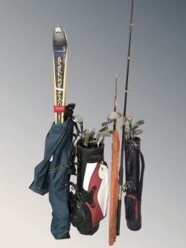 Three golf bags containing assorted irons and drivers including Ben Sayers, Calloway, etc.