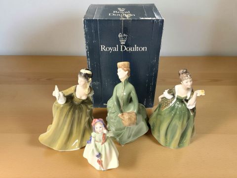 Three Royal Doulton figures of ladies 'Fleur' HN2368, 'Grace' HN2318 and 'Simone' HN2378, and a further smaller figure 'Babie' HN1679.