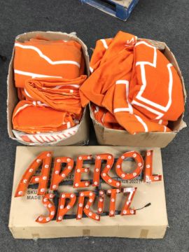 An Aperol Spritz illuminated sign and quantity of similar blankets CONDITION REPORT: Removed from local restaurant which has gone into liquidation, but sold as seen.