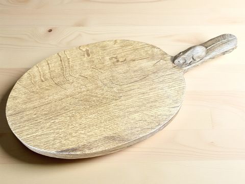 A Robert 'Mouseman' Thompson of Kilburn oak cheese board, with carved mouse signature, length 39.5 cm.