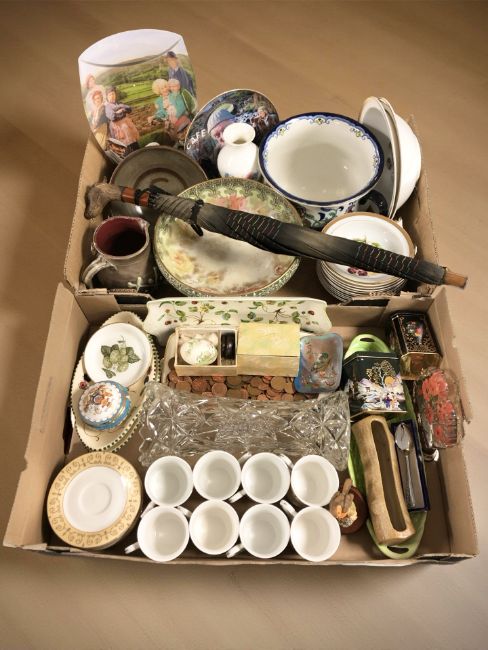 Assorted ceramics and glass wares, tins, coins, umbrella with dogs head handle, etc. (2 boxes)