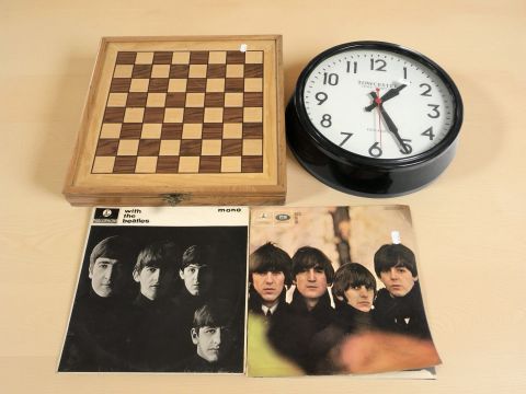 Two The Beatles vinyl LP records, medieval resin chess set with board, quartz wall timepiece signed Towcester Clock Works