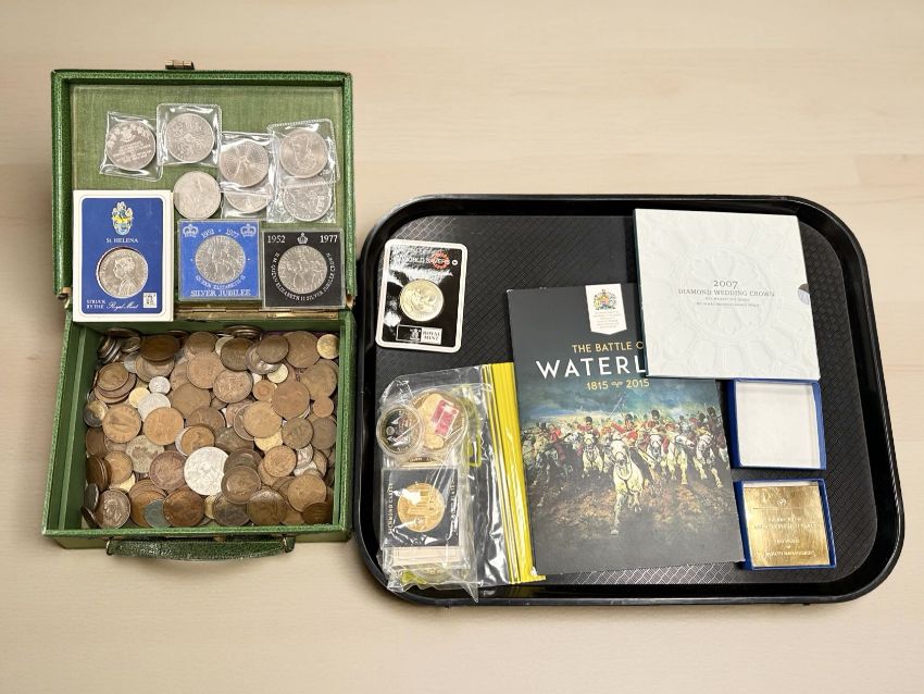 Assorted pre-decimal coins, commemorative crowns, 2007 Diamond Wedding Crown, other coins, Credit Suisse paperweight etc