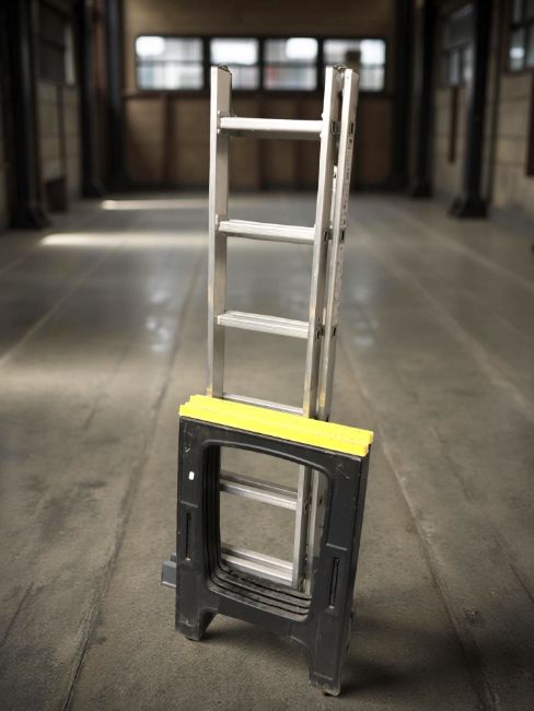 An aluminium ladder and two plastic trestle stands