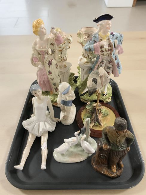 A pair of continental porcelain spill vases in the form of a lady and gentleman, further figures including Nao, Border Fine Arts reflection figure 'Heron', etc.