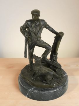 After Moreau : A patinated metal figure of a shooter and gun dog, on marble circular plinth, height 28 cm.