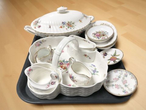 A group of porcelain including Minton Marlow twin handled tureen, a Coalport porcelain tea basket containing matching milk and sugar, other items including Hammersley, Limoges, etc.