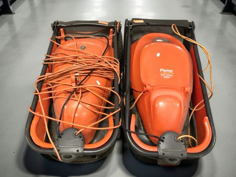 Two Flymo electric lawn mowers