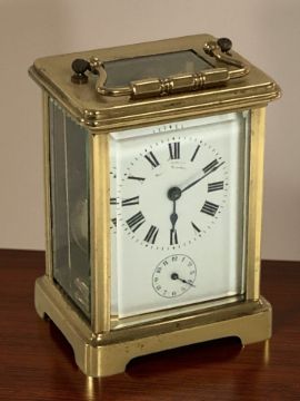 A French brass carriage timepiece, height 14.5 cm including handle, with key.