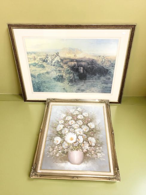 Samson (Contemporary) : Still life of flowers in a vase, oil on canvas, 60 cm x 50 cm, together with a print after Russell depicting Native Americans.