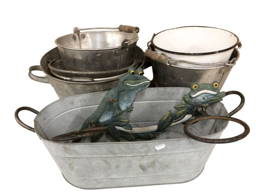 A group of galvanized and other metal planters, buckets, plant pots, etc