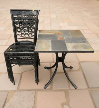 A slate topped square garden table, width 70 cm, and four stackable metal chairs