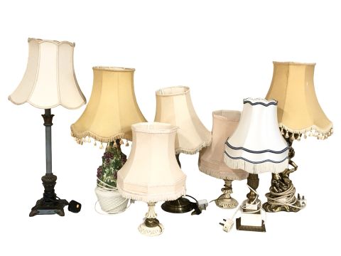 A group of contemporary table lamps with shades.