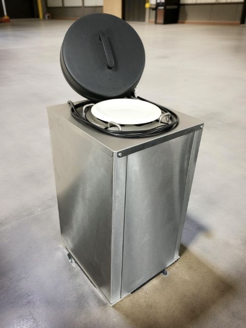 A stainless steel hot plate on castors.