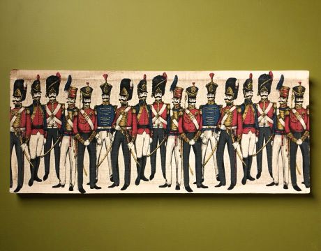 A vintage linen panel depicting soldiers, 46 cm x 112 cm
