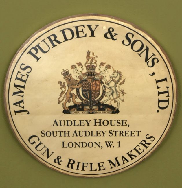 A reproduction James Purdey & Sons Ltd Gun and Rifle Makers circular wooden advertising plaque, diameter 80 cm.