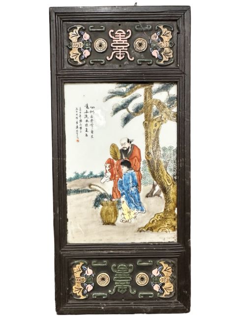 A 19th century Chinese ceramic panel, hand painted and decorated with figures by a tree, 30.5 cm x 67.5 cm.