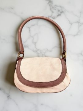 A Mulberry pink fabric bag with Burgundy leather edges and strap, brass toned hardware and one internal open pocket on cream lining, 23cm wide.