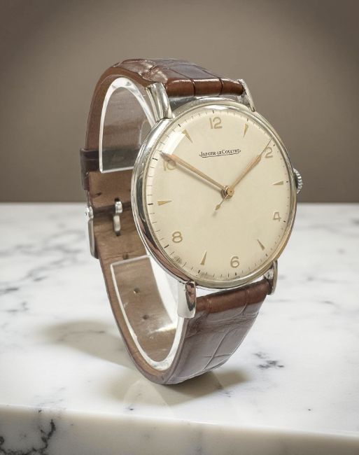A gent's vintage stainless steel Jaeger LeCoultre centre seconds manual wind wristwatch, the cream dial with Arabic and arrow numerals, sword hands, case back numbered 549052, case 35mm.