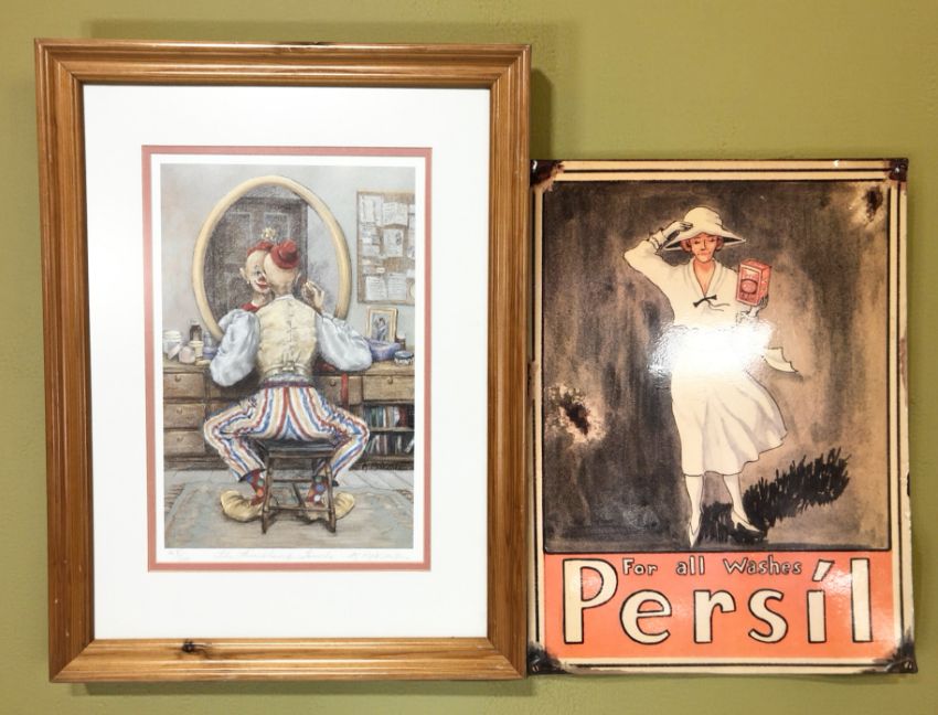 After A. Makinson : The finishing touch, limited edition colour print, signed in pencil, number 48/500, 29 cm x 19 cm and a reproduction Persil metal sign