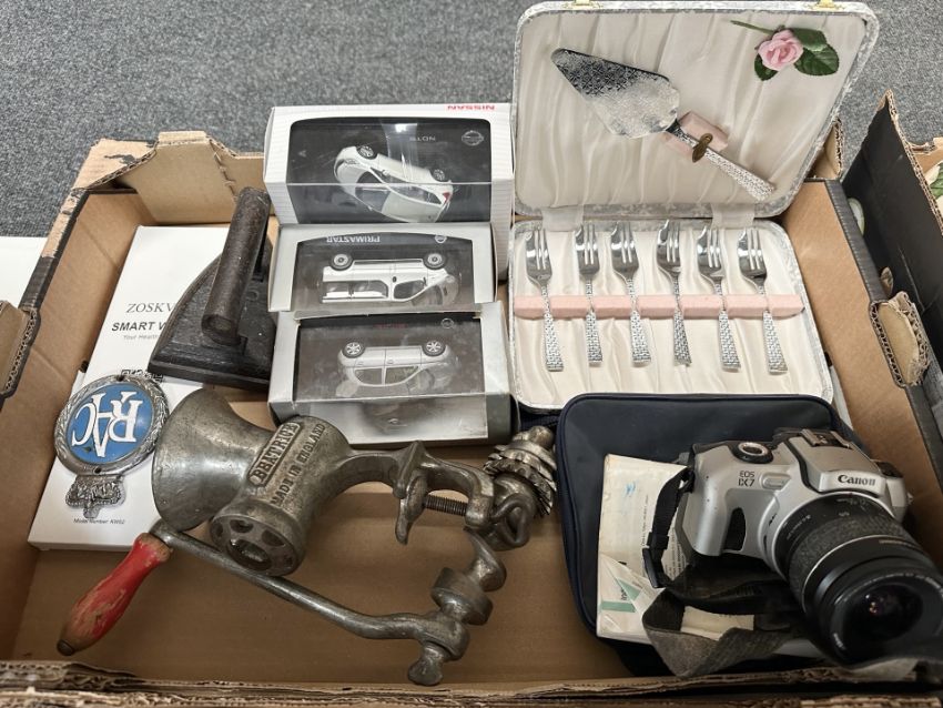 Assorted items including Canon IX7 camera, pair of Halina 10x50 binoculars, decanter, die cast cars, cutlery, royal commemorative crowns, mincer, etc. (2 boxes)