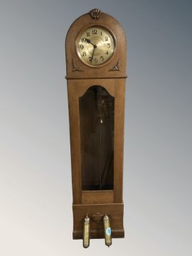 An early 20th century continental oak long case clock, with pendulum and weights, height 193 cm.