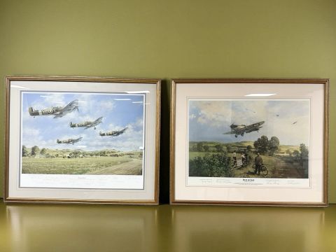 After John Young : Inspiration, limited edition colour print, signed by Spitfire pilots, 41 cm x 62 cm and a similar signed print after Michael Turner