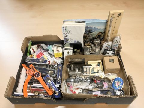 A quantity of collector's spoons, wristwatches, metal wares, badges etc (1 box)