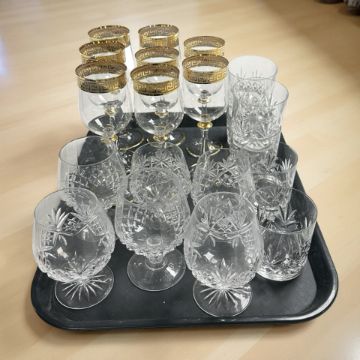 A set of eight Italian crystal wine glasses with gilt Greek key rim, six various Edinburgh Crystal tumblers and six various rummers