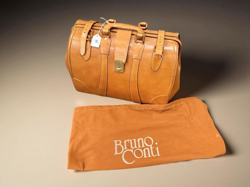 An Italian stitched tan leather case with dust cover by Bruno Conti