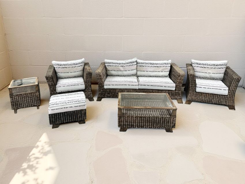 A wicker six piece conservatory suite comprising of three seater settee, pair of armchairs, stool and two glass topped tables