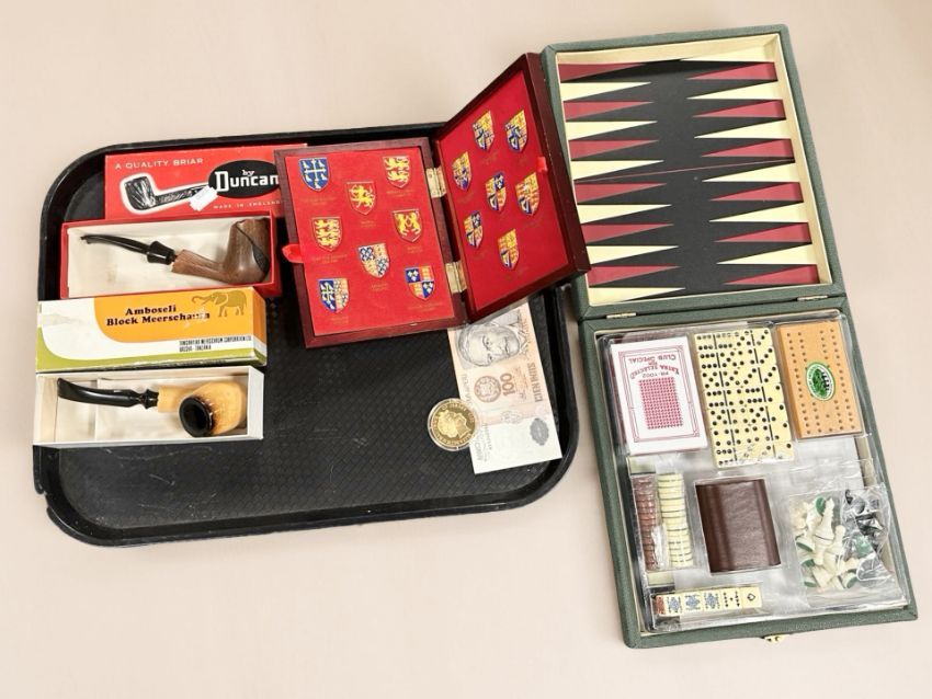 A Duncan Briar pipe in box, further Meerschaum pipe in box, a set of enamel lapel badges the Kings and Queens of Great Britain, a games compendium, gilt metal coin and Peruvian bank note