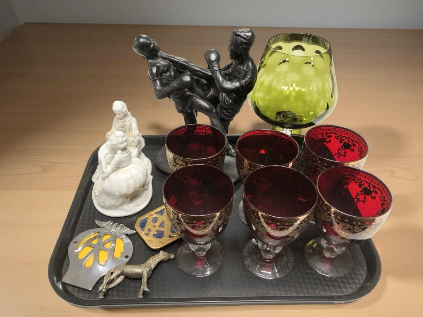 A set of six ruby glass goblets, further large green goblet, figural group of two kick boxers, AA and RAC badges, Leonardo figure group etc