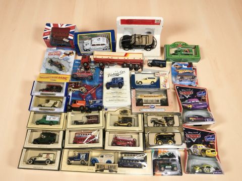 Boxed and unboxed diecast cars, trams, delivery vehicles including Corgi, Hotwheels, Disney etc (1 box)