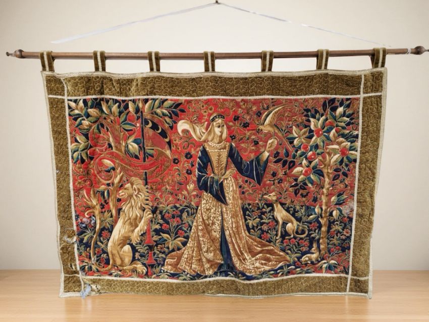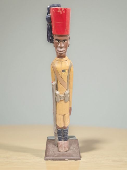 A painted wooden figure of a soldier wearing a fez, height 120 cm, together with a reproduction hanging tapestry (as found)