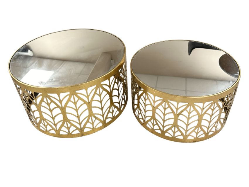 A pair of contemporary graduated gilt metal and mirror topped coffee tables, largest 75 cm diameter