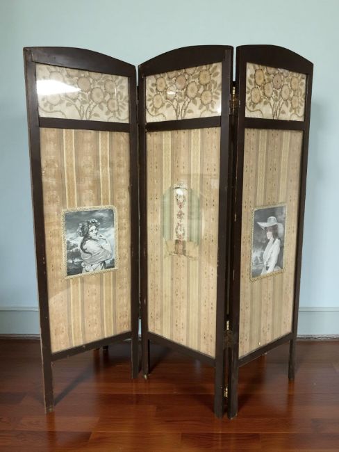 A small three-fold embroidered screen, each panel 106 cm x 33 cm