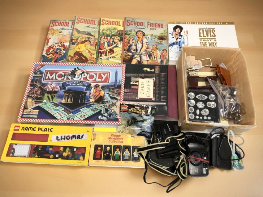 A group of children's annuals, doll's house furnishings, cameras, Monopoly game etc (1 box)