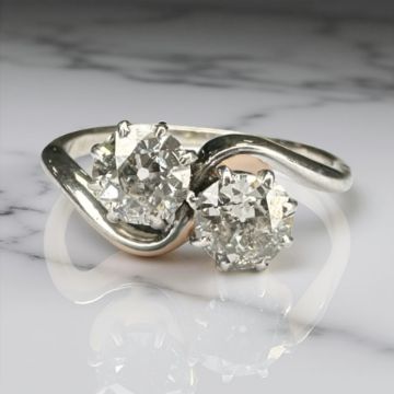 An antique platinum two stone cross-over diamond ring, approximately 1ct, size J.