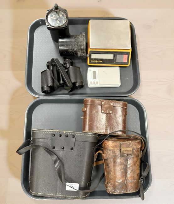 A bag containing binoculars, pair of military 1908 binoculars, electronic scales etc