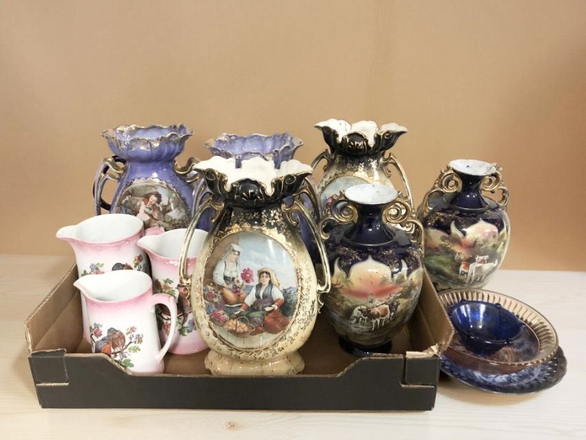 A group of transfer printed pottery vases, graduated jugs, glass bowls etc (1 box)