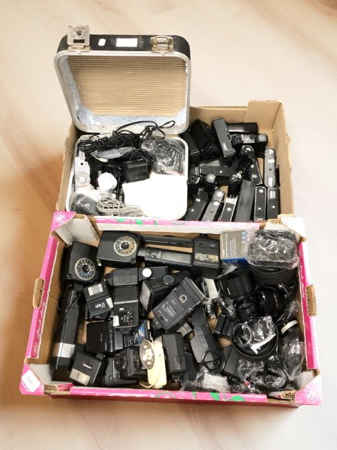 A quantity of camera auto winders, flashes, lens covers and similar accessories. (2 boxes)