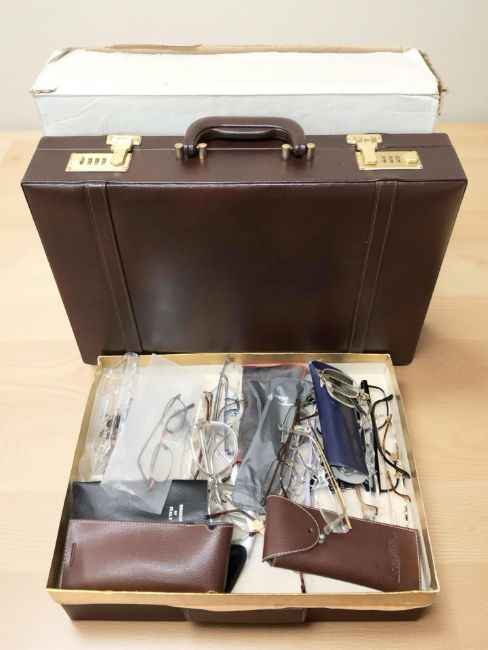 A briefcase and several pairs of glasses.