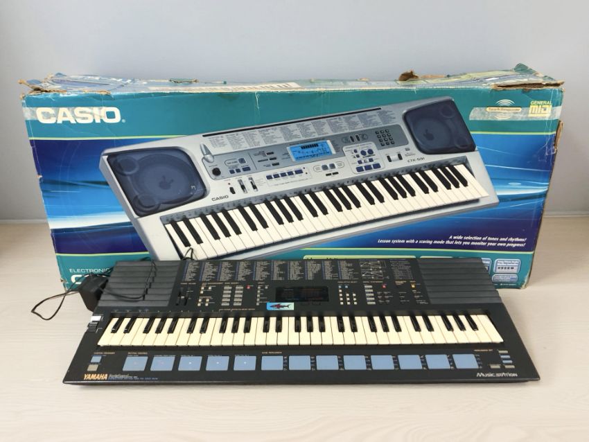 A Yamaha Porta Sound PSS-680 music station and a Casio keyboard in box.